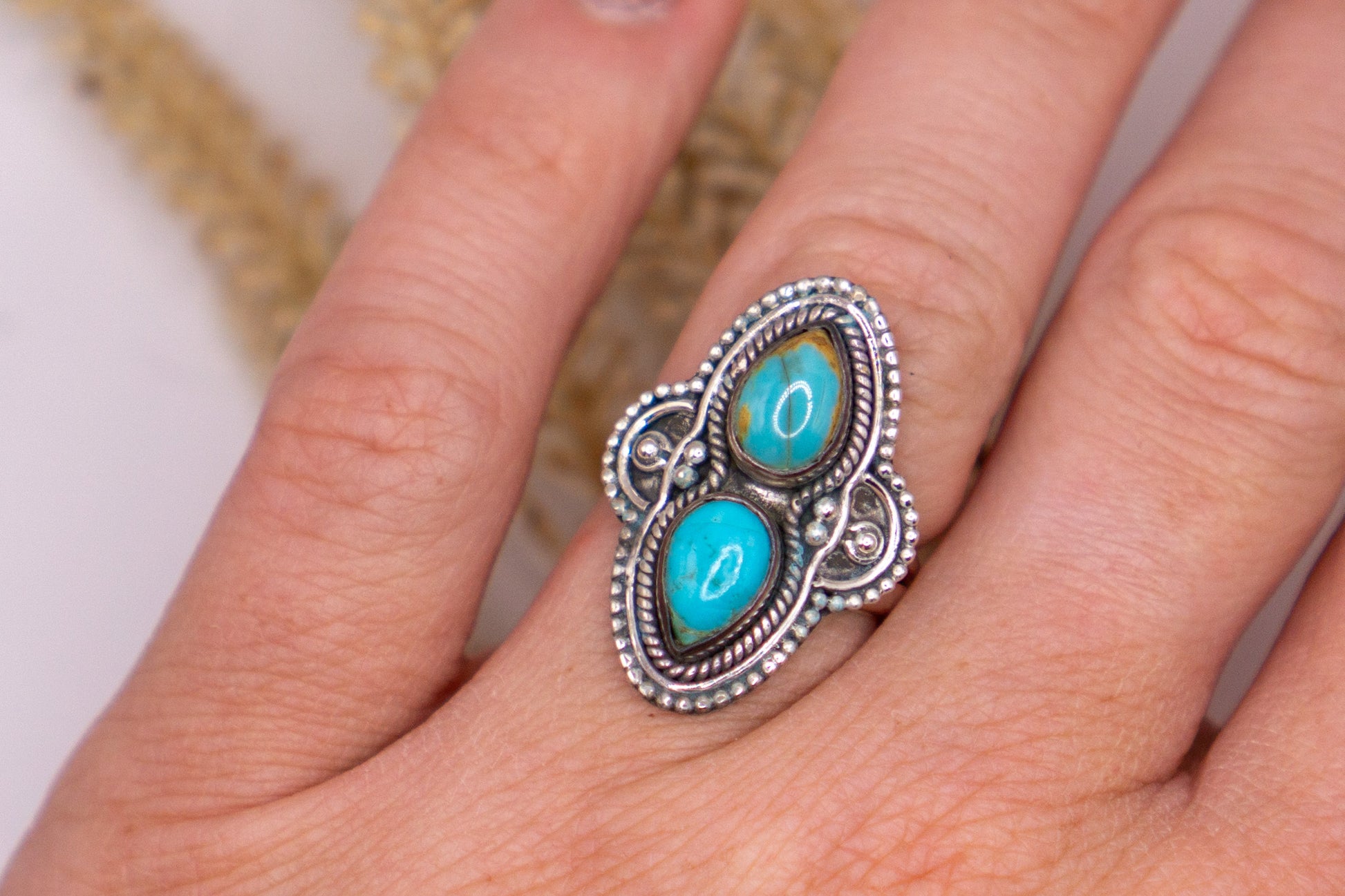 Double the turquoise, double the beauty. This 2-stone stacked turquoise ring is a striking piece handcrafted in solid sterling silver (.925). Designed for lovers of bold and authentic gemstone jewelry, it layers two genuine turquoise stones for an eye-catching, boho-chic style.