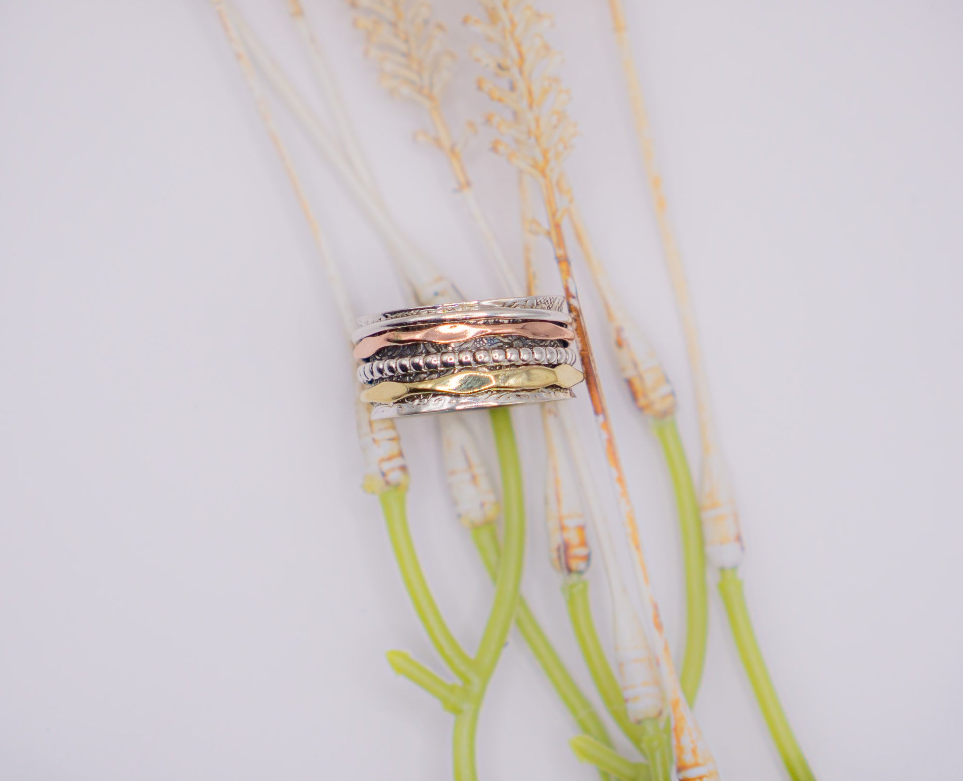 Four Spinner Bands: Includes one hammered silver, one beaded silver, one copper, and one brass spinner — each moves freely around the silver base ring.