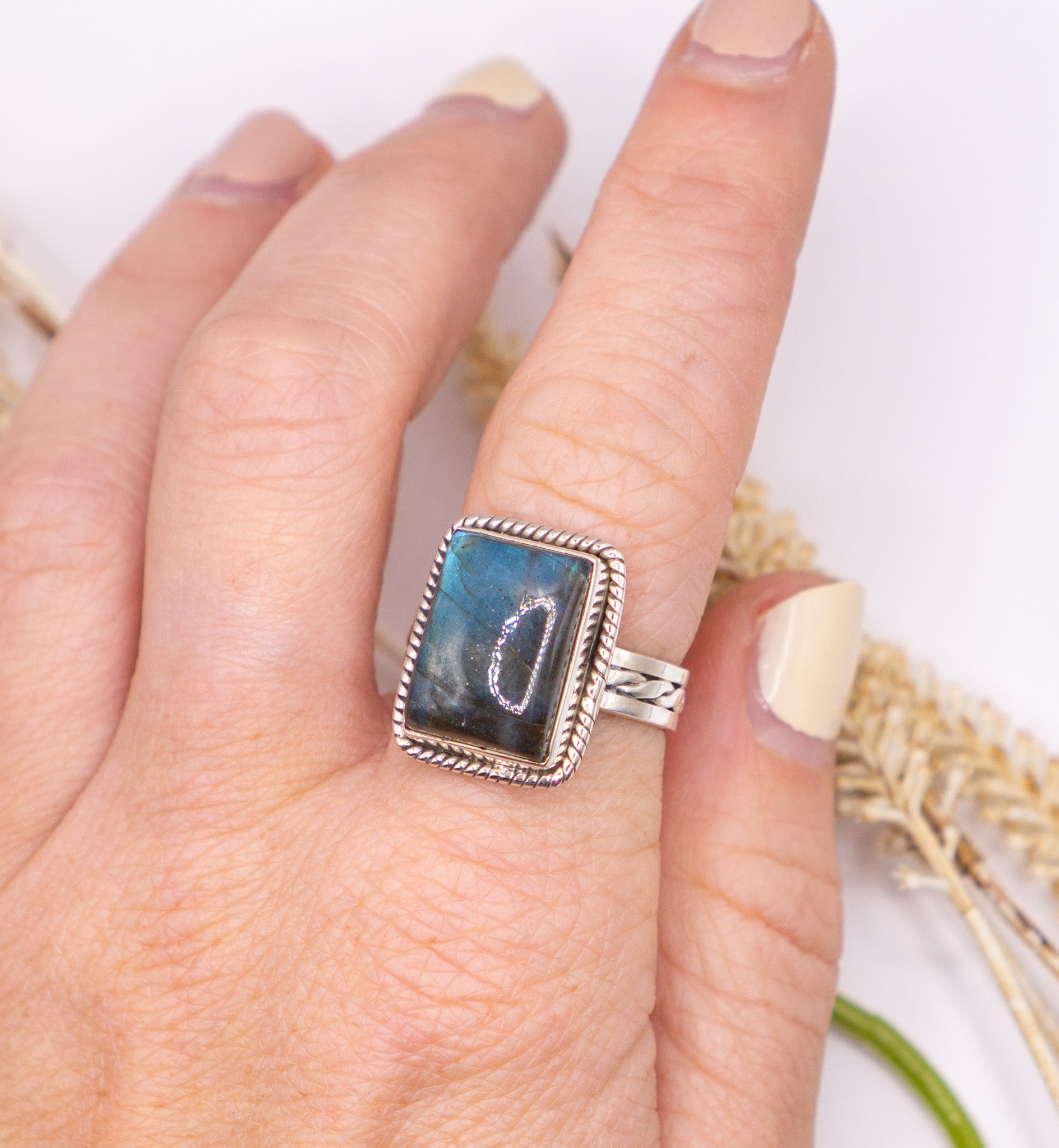 Mystical and eye-catching, this labradorite statement ring features a glowing gemstone set on a detailed braided sterling silver band. Handcrafted in solid sterling silver (.925), it combines timeless artistry with the captivating flashes of color that make labradorite so alluring.