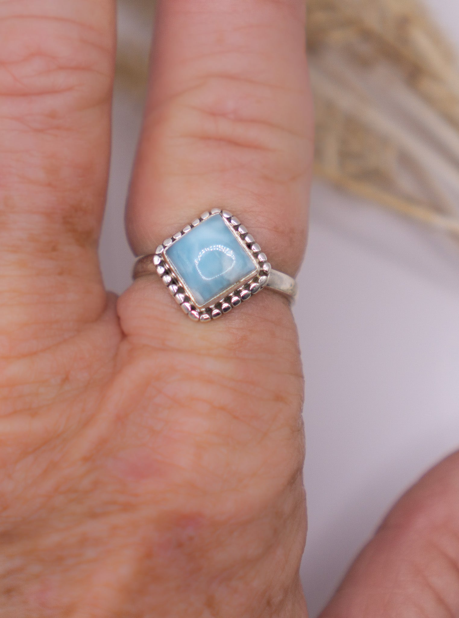 Delicate yet striking, this diamond-shaped larimar ring is framed in a refined beaded sterling silver setting. Handcrafted in solid sterling silver (.925), it’s a dainty design with artisan character, perfect for adding a touch of ocean-inspired elegance to your everyday look.