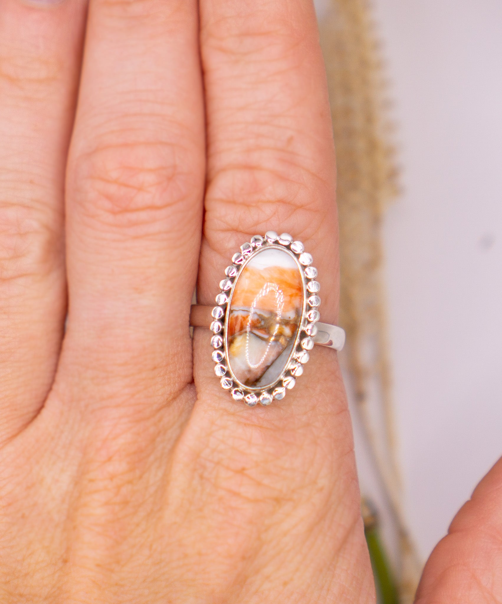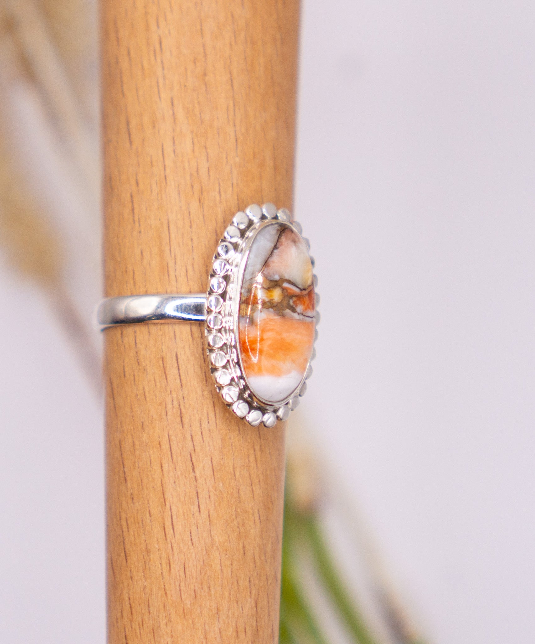 ✨ Gemstone Facts: Spiny oyster turquoise blends oyster shell and copper, creating vibrant swirls of orange, cream, and copper with no two stones alike. The stone pictured is the ring you will receive.