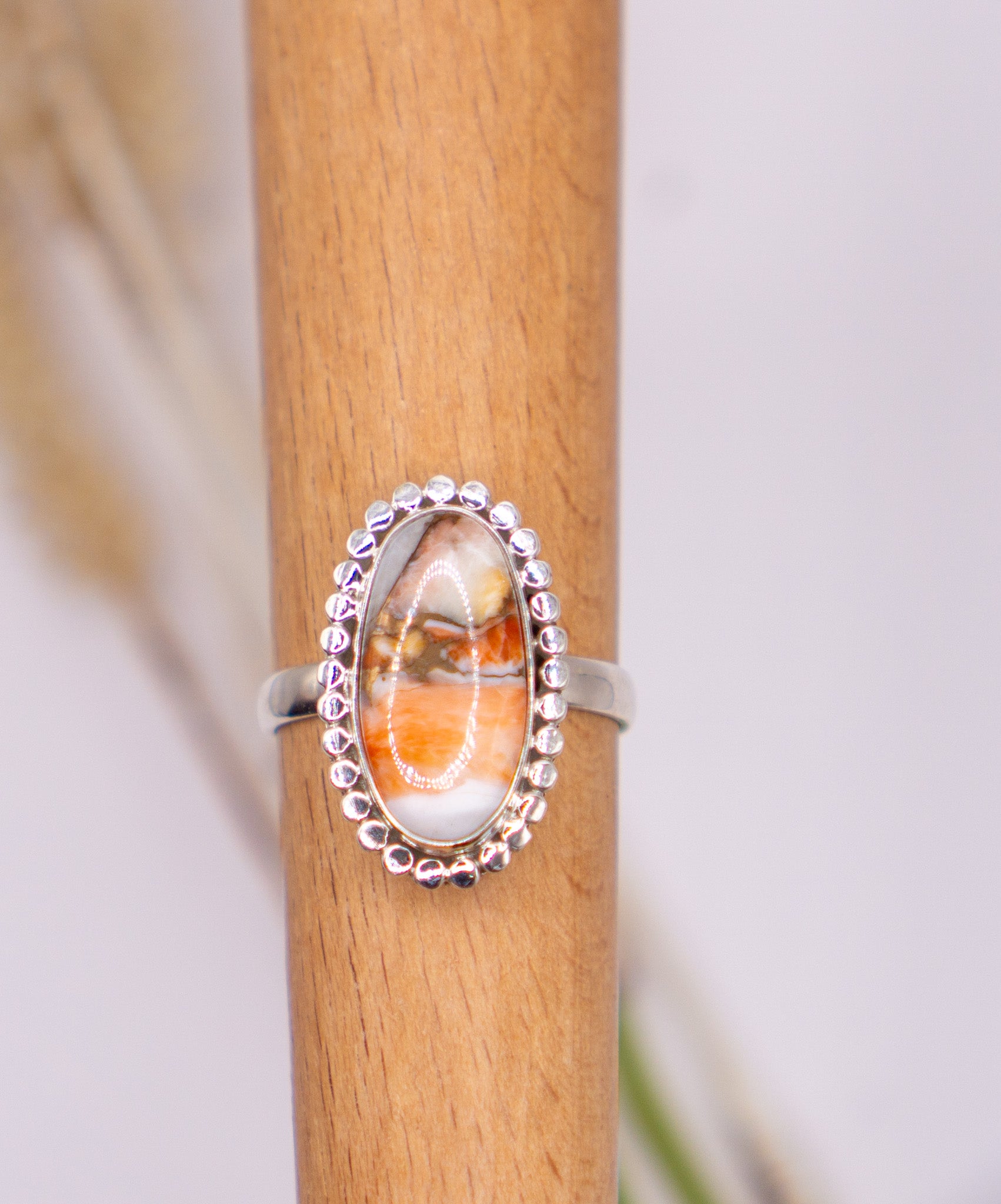 Elongated Oval Spiny Oyster Turquoise Ring with Beaded Setting – Solid Sterling Silver .925
