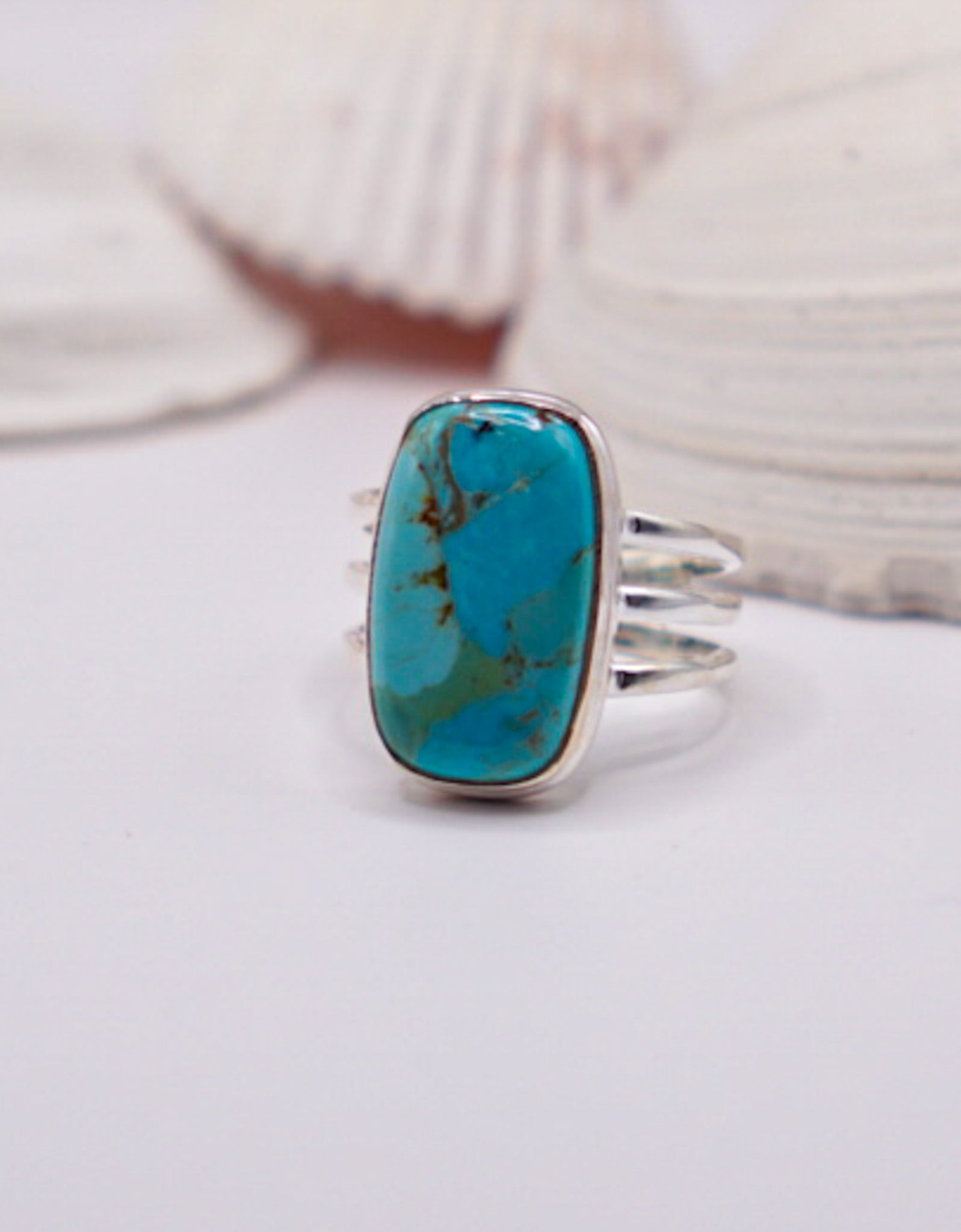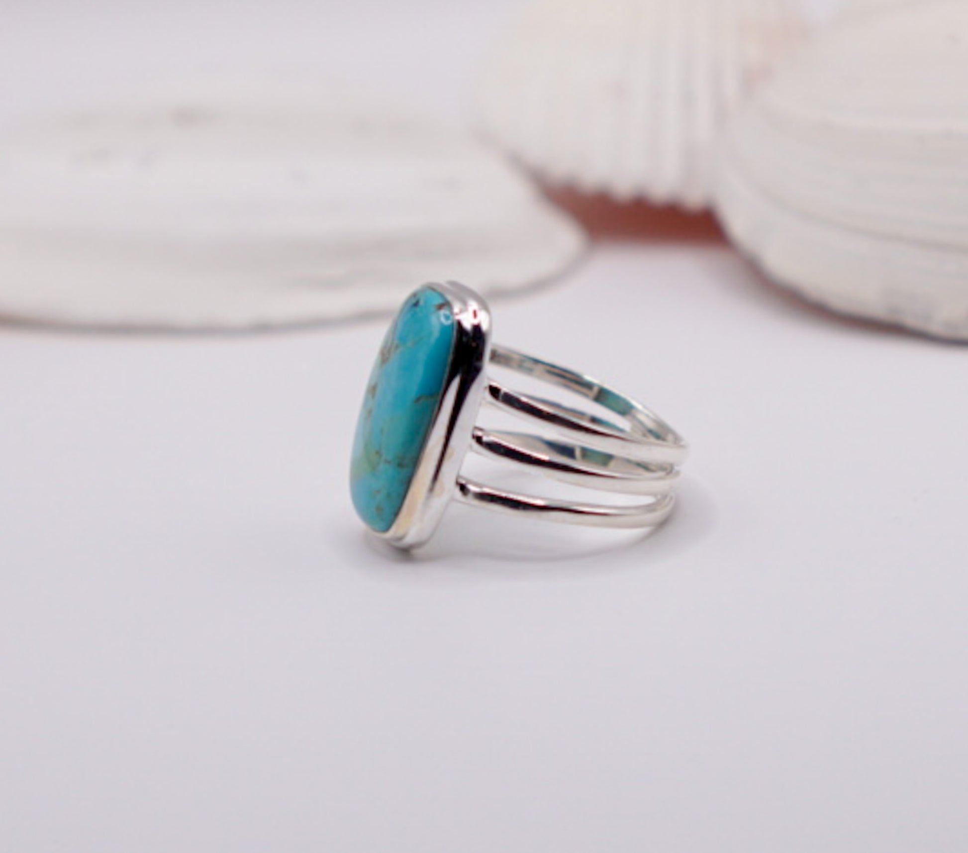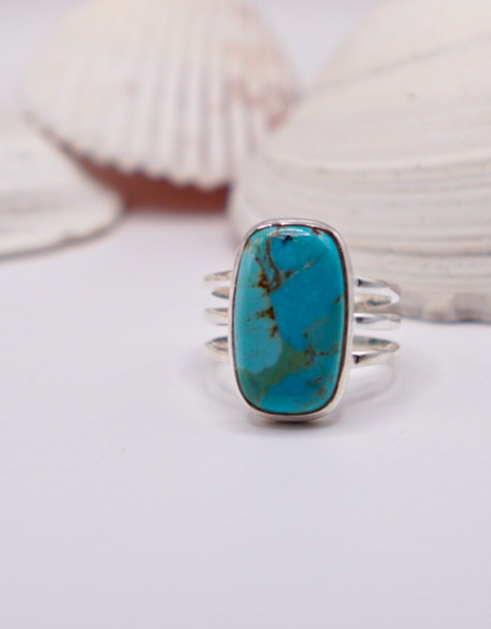 Bold, earthy, and beautifully unique—this handmade Mojave Turquoise ring features a genuine Kingman, Arizona turquoise gemstone, set in a handcrafted triple-band sterling silver design. Each ring is a wearable piece of the Southwest, blending striking color with rustic elegance. The ring you see in the photo is the ring you will receive.