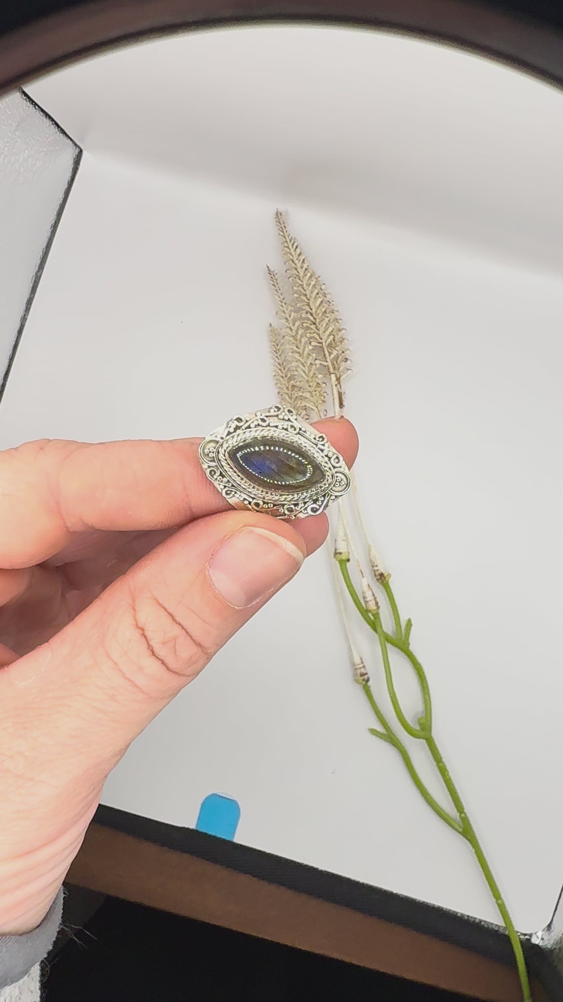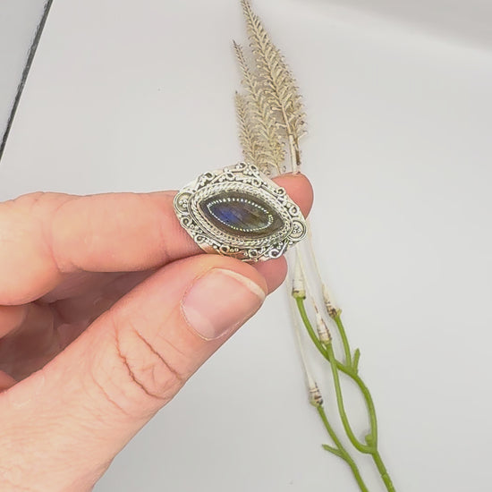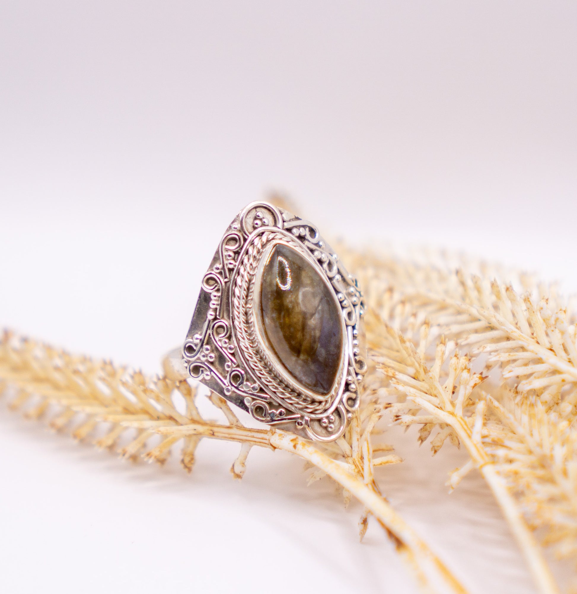 Mysterious and mesmerizing, this labradorite ring is handcrafted in solid sterling silver (.925) and showcases the gemstone’s stunning flashes of blue, green, and gold. Known for its ever-changing shimmer, labradorite captures the light with a magical iridescence, creating a one-of-a-kind statement piece that feels alive with color.