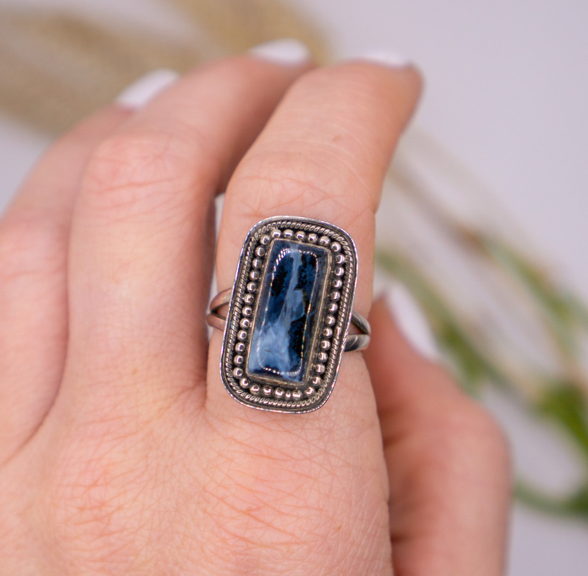 Bold and mesmerizing, this long rectangular pietersite ring is crafted in solid sterling silver (.925) and framed with an elegant beaded bezel. Pietersite is known for its swirling storm-like patterns and flashes of deep blue, gold, brown, and charcoal — giving this piece incredible movement and depth.