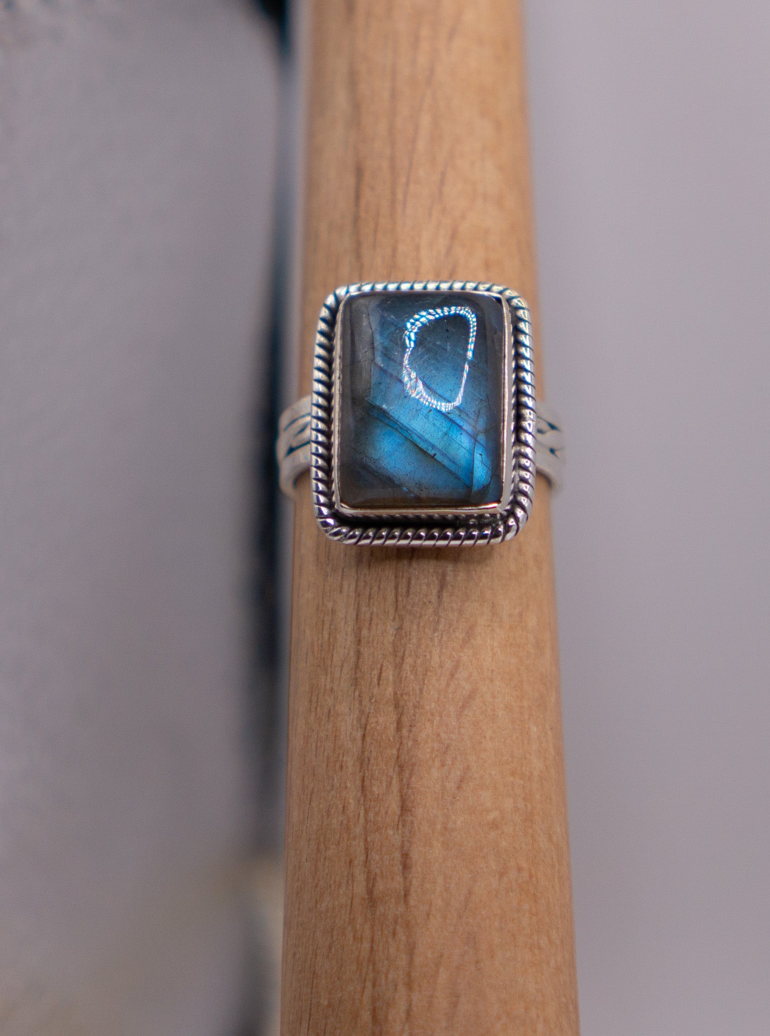 Mystical and bold, this rectangular labradorite ring is handcrafted in solid sterling silver (.925) and finished with intricate rope framing and a braided silver band. The unique design highlights the natural flashes of color within the gemstone, making this a powerful and eye-catching statement piece.