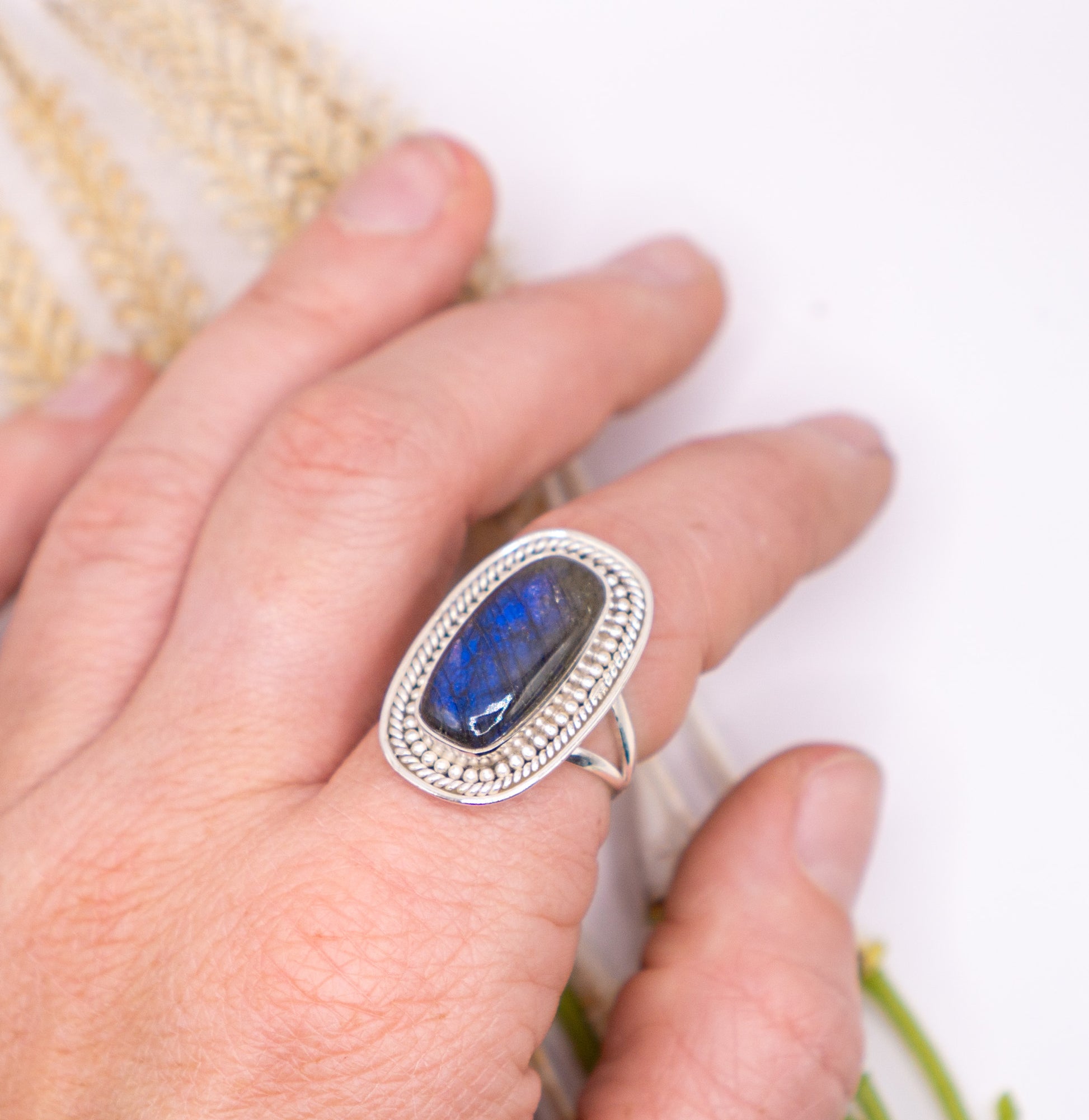 Enchanting and luminous, this rectangular labradorite ring is handcrafted in solid sterling silver (.925) and framed with a detailed beaded silver border. The gemstone shimmers with brilliant flashes of blue, green, and gold — a mesmerizing play of color that shifts with every movement.