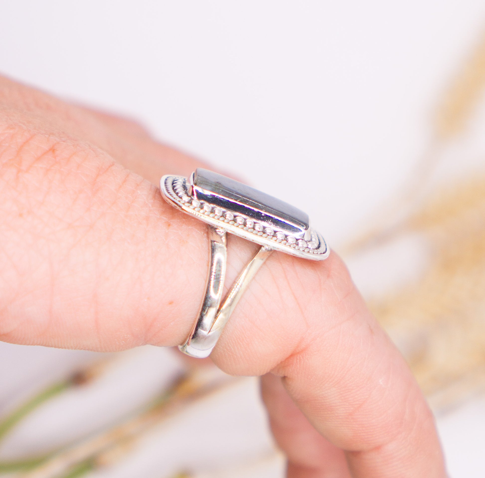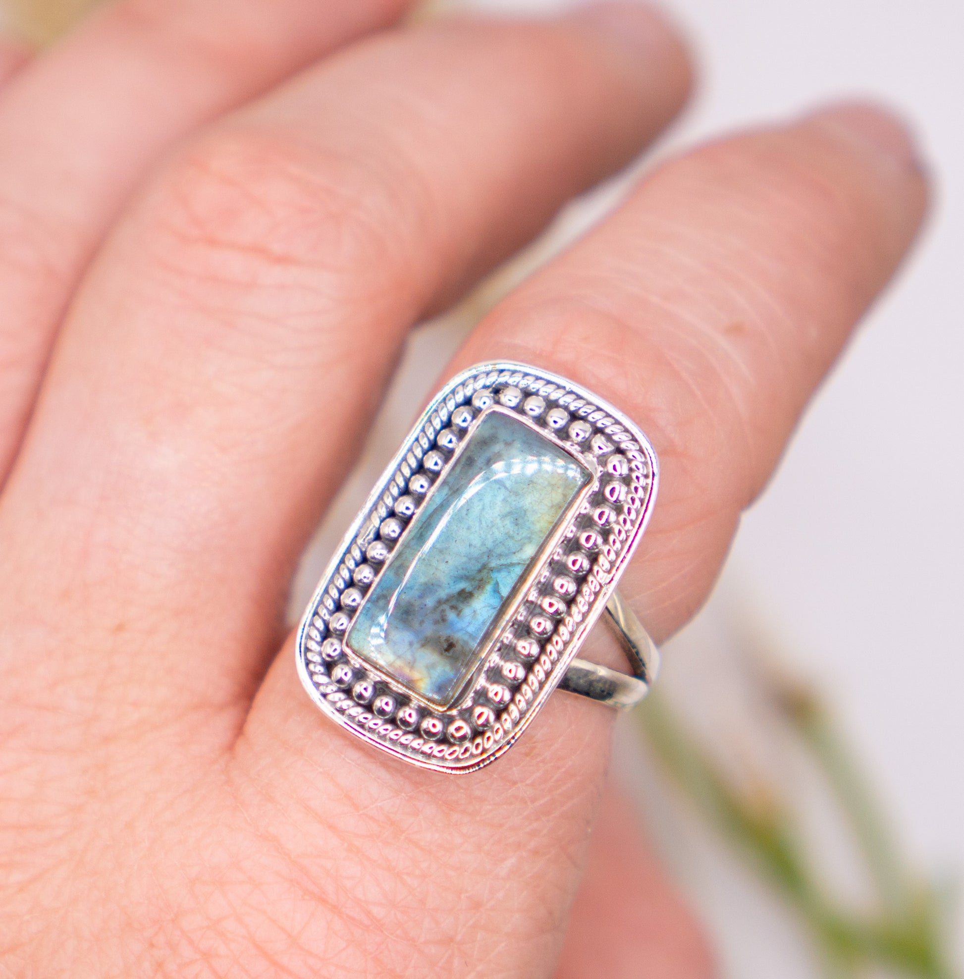 Captivating and full of light, this rectangular labradorite ring is crafted in solid sterling silver (.925) and framed with a beautiful beaded silver border. The gemstone shimmers with brilliant flashes of blue, green, and gold, creating a mesmerizing effect that changes with every movement.