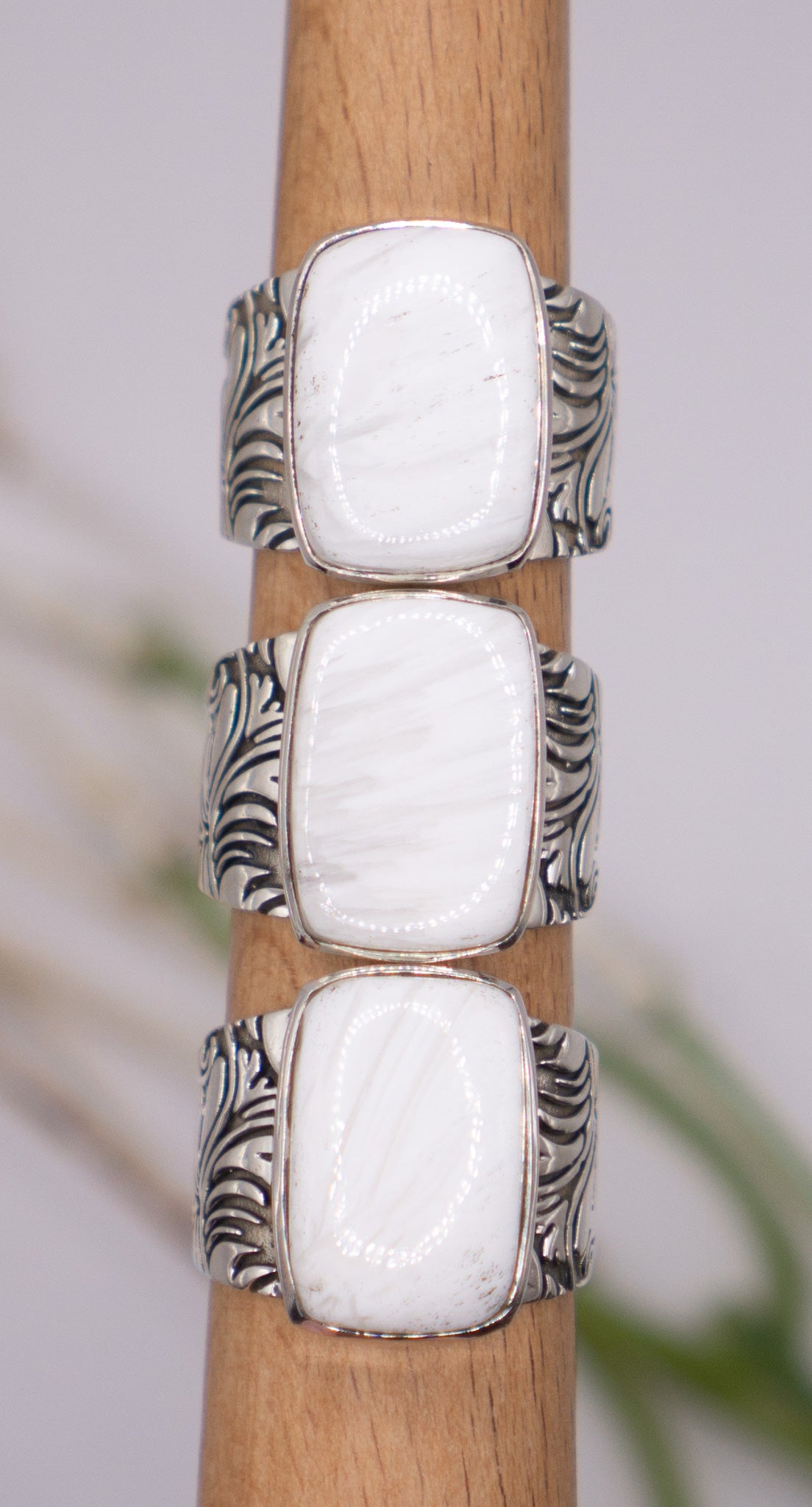 Elegant and distinctive, this large scolecite ring is crafted in solid sterling silver (.925) and set on a wide decorative band that adds texture and character. The natural stone displays beautiful white and cream patterns with subtle shimmer, creating a serene and sophisticated statement piece.