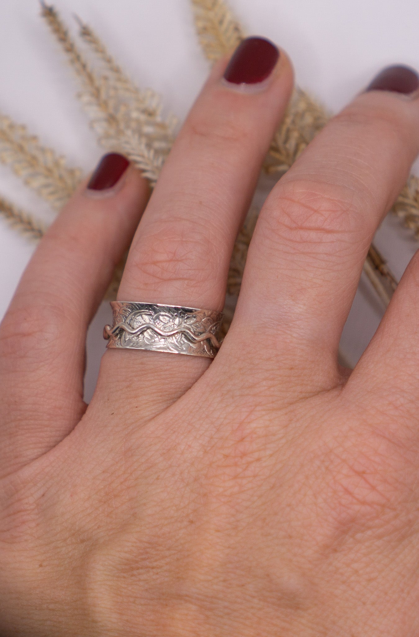 Graceful and calming, this floral spinner ring features a wide solid sterling silver band adorned with delicate floral stamping, paired with a single wave-pattern spinner band. The design blends elegance with function, making it both a beautiful accessory and a soothing fidget ring.