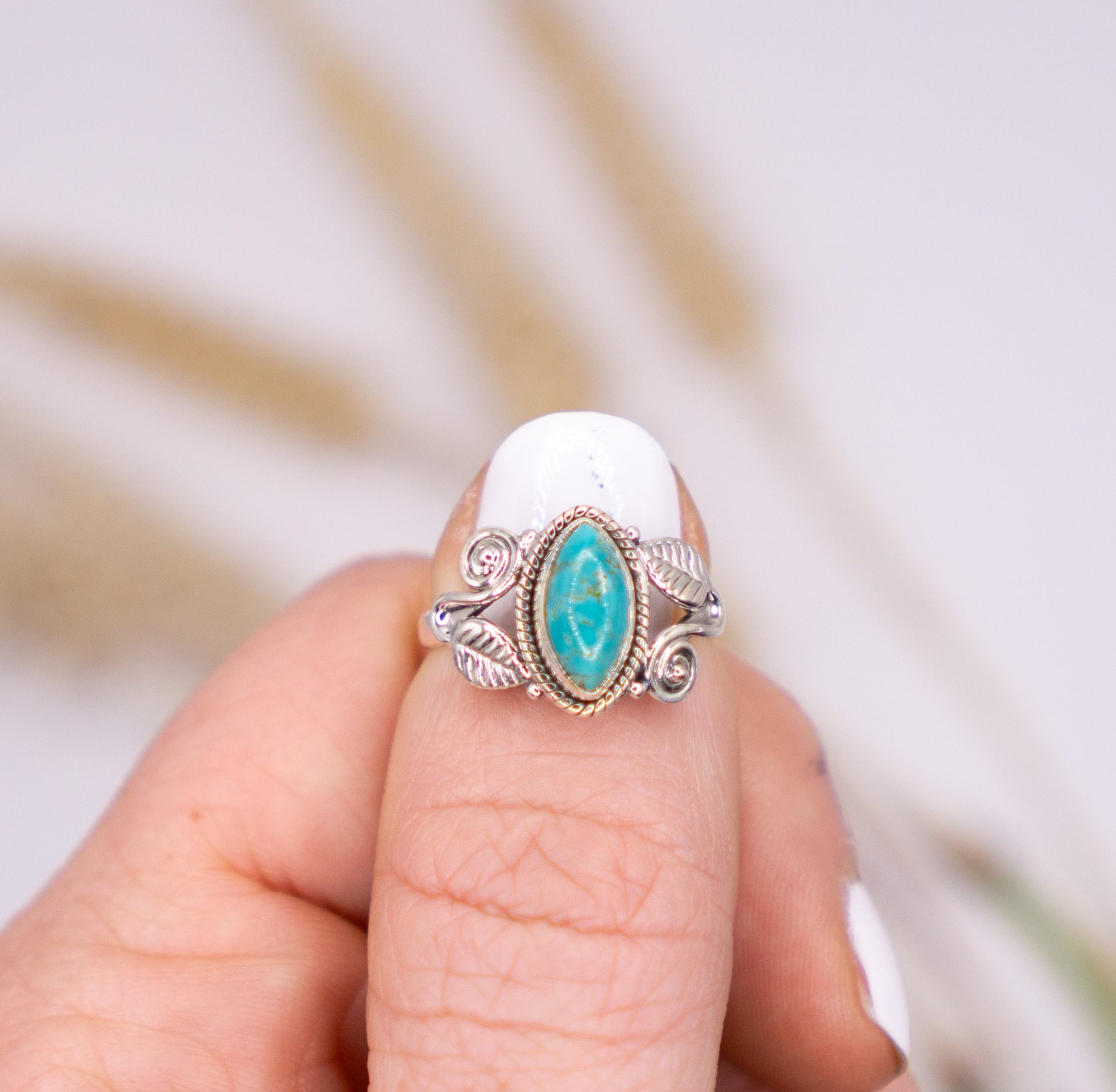 Dainty yet full of character, this small turquoise ring is crafted in solid sterling silver (.925) and accented with elegant scrolling silver details that frame the stone beautifully. The turquoise adds a vibrant pop of blue-green color, making this piece perfect for everyday wear or stacking.