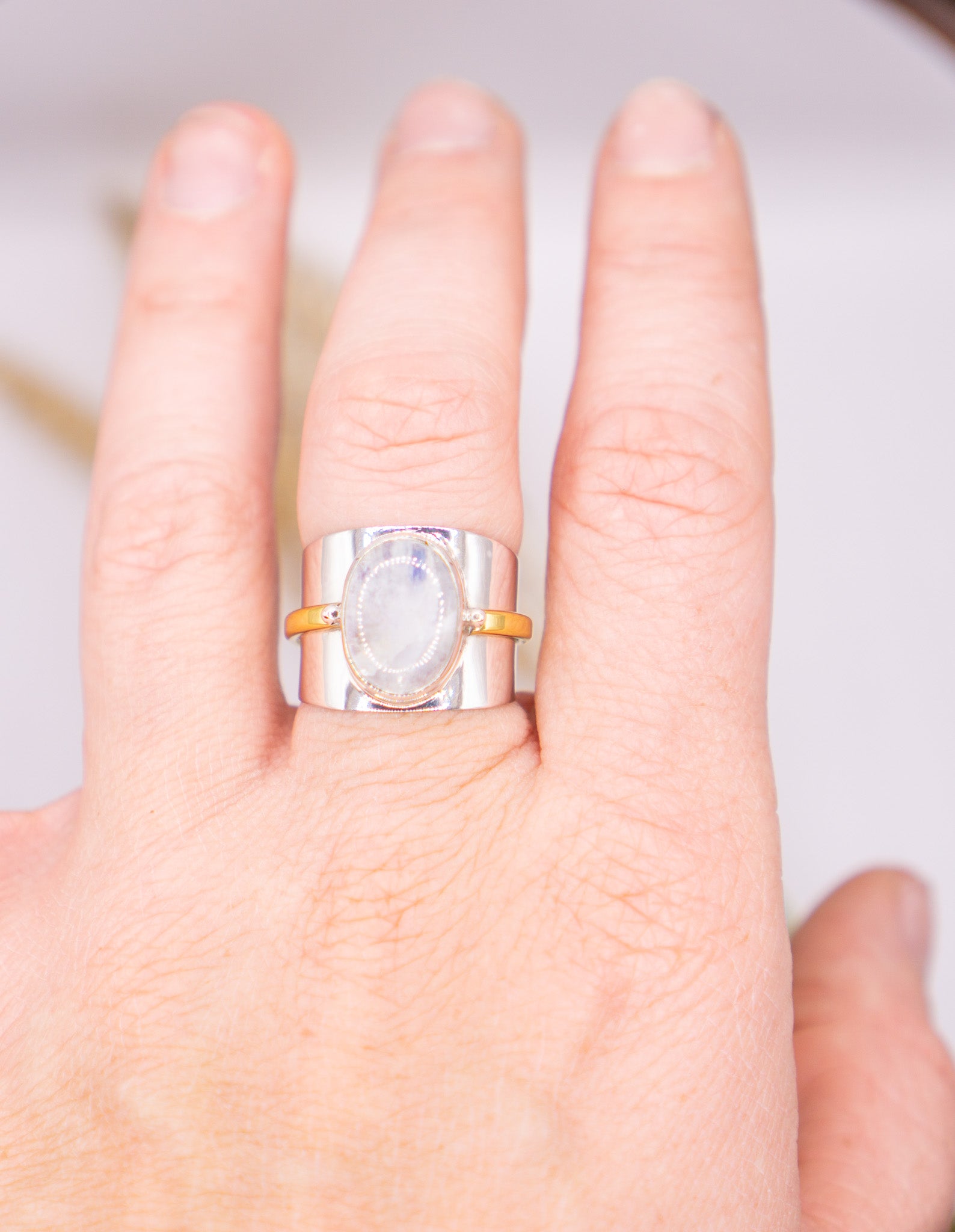 Moonstone’s ethereal glow makes this ring timeless and elegant.