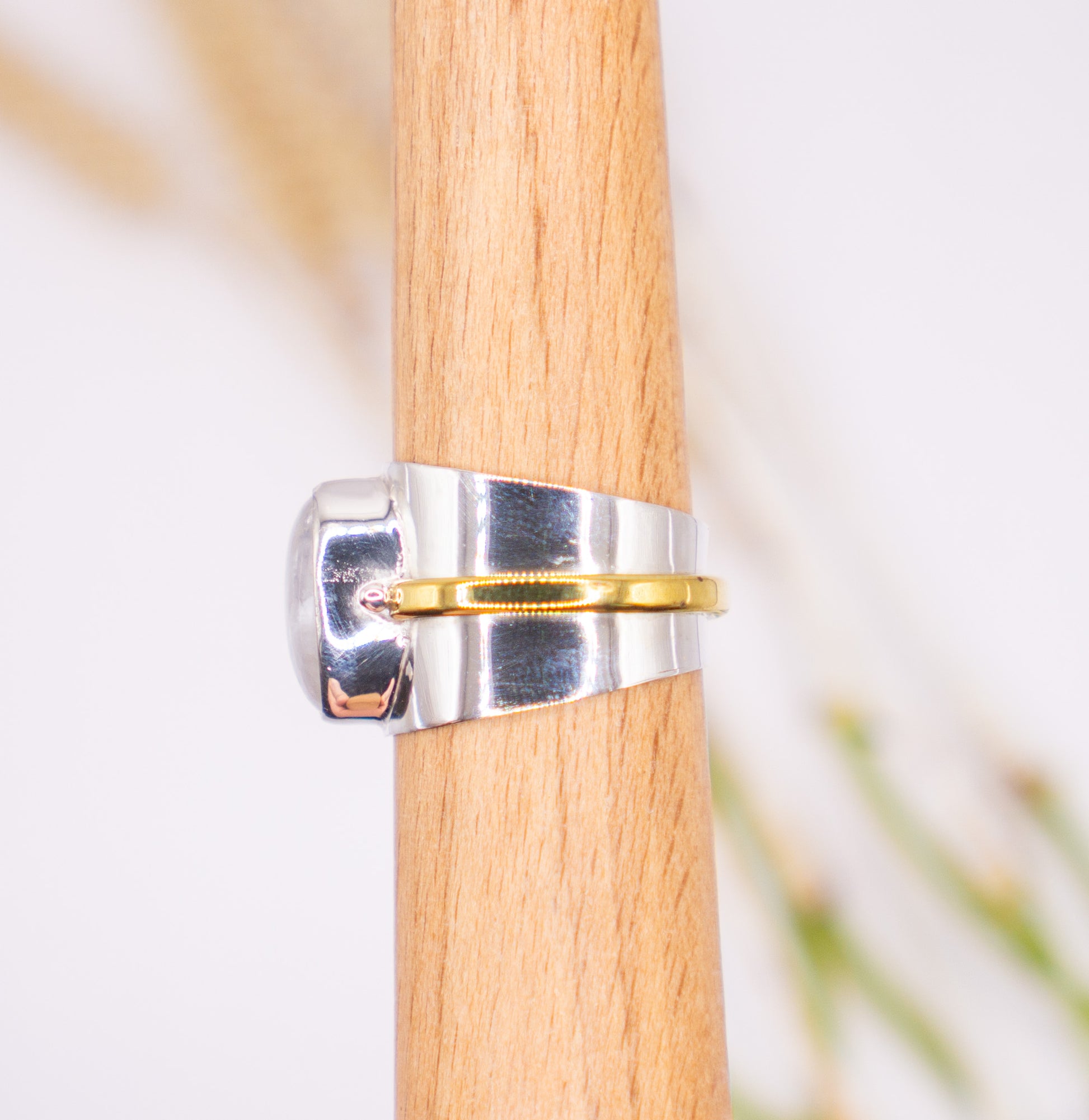 Ethereal and elegant, the Moonstone “Queen” Ring is a signature mixed-metal design handcrafted in solid sterling silver (.925) with a warm brass wrap around the band. This stunning combination of metals allows both silver and gold lovers to wear it effortlessly, while the glowing moonstone radiates soft, celestial beauty.